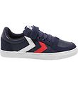 Cool Hummel shoe in white leather with beige suede details, and on both sides of the shoes are the well-known Hummel shevrons in navy and red. On the heel there is a navy logo.
