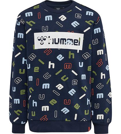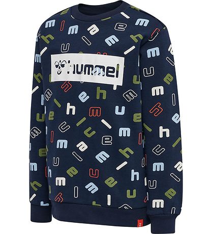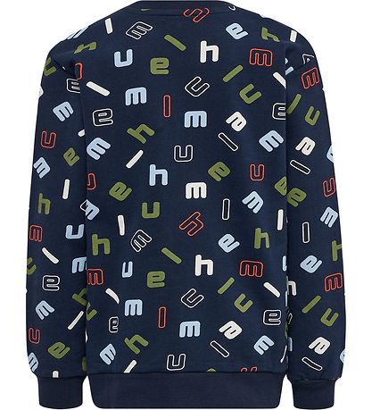 Smart Hummel sweatshirt in navy with an all-over-print of multicoloured letters. At the front there is a large logo in white.