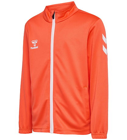 Smart Hummel tracksuit consisting of an orange cardigan and a pair of dark blue trousers. The Tracksuits is adorned with the Hummel logo on both the top and bottom.
