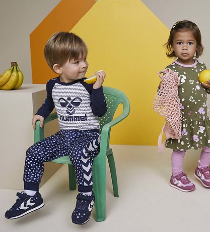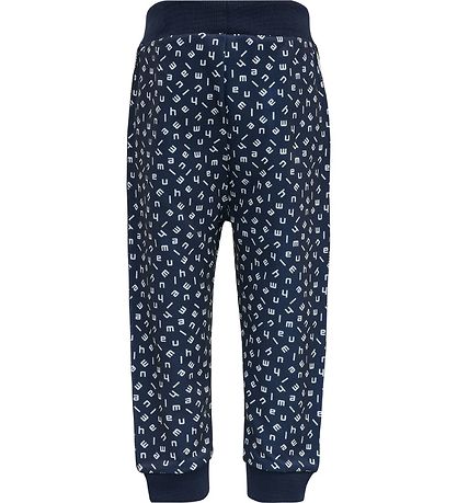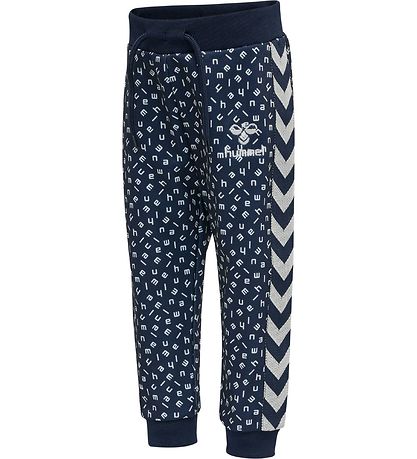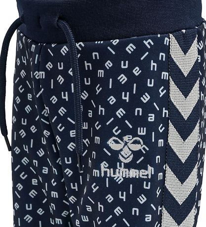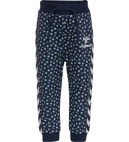Beautiful Hummel trousers in navy with all-over-print of different letters in white and with the classic Hummel logo embroidered on the left thigh. Down the legs are the characteristic Hummel shevrons in white.