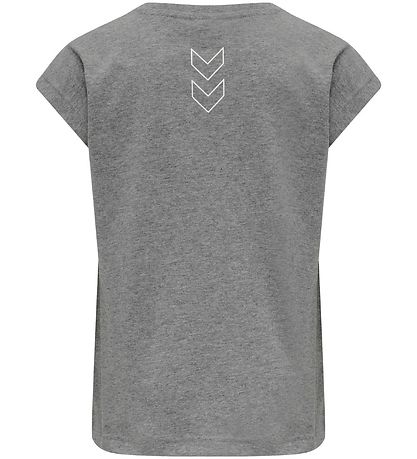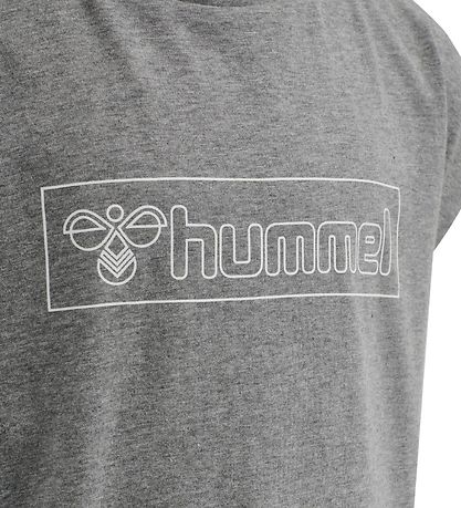 Smart Hummel T-shirt in melange grey with a square on the chest with the Hummel logo and "Hummel" printed in white. The top of the back is the outline of Hummel's familiar shevrons in white.