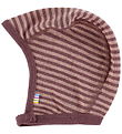 The Huttelihut baby hat has a round head shape and has flaps that go down over the ears. It is tied under the chin with a drawstring.