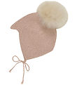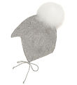 Lovely Huttelihut baby hat knitted from soft alpaca wool in off white and with a white fur pom pom on top.