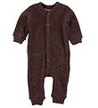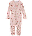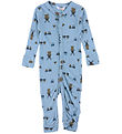 Smart Joha jumpsuit with long sleeves in a light blue colour, decorated with a print of tractors and windmills. The Jumpsuit has push buttons at the front from the neck and down the left leg. It has long legs with w. footies that can be folded up.