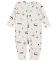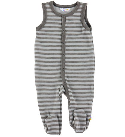 The Joha romper has wide shoulder straps and long legs with fixed feet. The Romper opens at the front with practical, continuous push buttons, which starts at the neck opening and end at the left ankle. The Romper is made of a soft and comfortable wool quality.