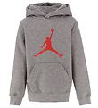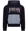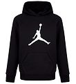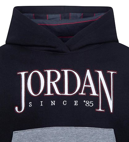Cool Jordan hoodie in black with a nice embroidered text print on the chest in white with red stitching around "Jordan". At the left wrist there is a white logo print and as a nice contrast, there is a grey melange kangaroo pocket on the stomach. The lining in the hood has a fine striped design in grey, black and red.