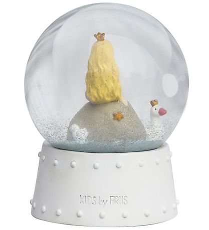 Sweet Kids by Friis snow globe with a base in white with small, fine balls. Inside the snowball, the little mermaid sits on a rock in the water with a princess crown on her head.