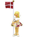 Nice Kids by Friis table figurine shaped like a soldier dressed in the traditional guard uniform. The guard stands in front of a red painted house, and in his right hand he holds a rifle and in his left is a large, Danish flag on a long, white flagpole.