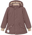The Mini A Ture winter coat has a removable hood that attaches to the outside of the fleece-lined collar with push buttons. The hood has a round shape and on the inside there is an elastic edge so that the hood fits snugly to the face.