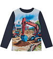 Nice Minymo blouse in melange grey, and on the front there is a colorful print with three of the dogs from Paw Patrol. Above is "team PP" printed in blue. On the back there is a print with the three dogs seen from behind.