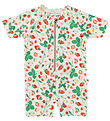 Beautiful Molo coverall swimsuit with light bottom and with an all-over-print of smiley and large stains in watercolour style, in great colours. The swimsuit has decorative ruffle edges along the zipper and in the waist at the back.