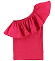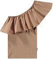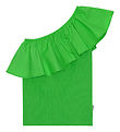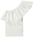 The Molo top has a fine ribbed structure and has no sleeves, but a wide ruffle edge at the neckline that also extends over the shoulders.