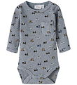 Charming Name It bodysuit with long sleeves in a blue-gray shade. The Bodysuit has a quirky print of scooters in different colours, and a pocket on the chest.