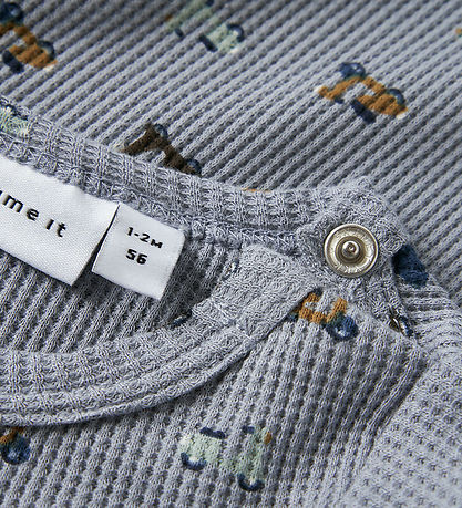 The Name It bodysuit has a waffle fabric structure. It opens at the left shoulder and between the legs with push buttons for easy handling when dressing and changing diapers.