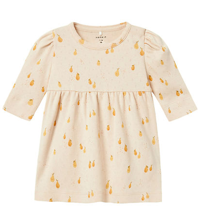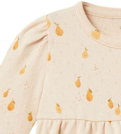 Cute Name It dress in light beige with a pink tint and with a pear print and decorative pointelle all over.
