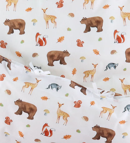 Fine Nørgaard Madsens bedding with colorful animal print in shades of brown and orange on a white background. The Bedding features fun elements such as bears and squirrels, ideal for kids.