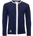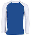 Beautiful Petit Crabe swim top in blue, with a fine print on the front of a parasol and the text "La dolce vita" in white and dark blue.