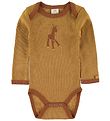 The Smallstuff bodysuit has long sleeves with ribbed edges edges in all openings. The Bodysuit has practical folding shoulders, and it is opens between the legs with push buttons.
