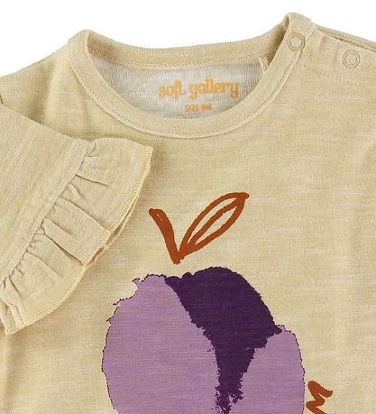 The Soft Gallery bodysuit has short ruffle sleeves, which creates a cute look. It has narrow ribbed edges around the neck and leg openings. There is a print of a plum as well as the text "Plum" at the chest. The bodysuit is opened with the two push buttons at the left shoulder and three push buttons between the legs.