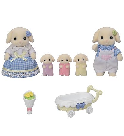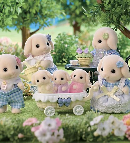 Cute Sylvanian Families toy figurine in the form of the Flora Rabbit family, which consists of father, mother and three babies, all of whom are white rabbits with a little flower by one ear. A little pram is included in which the three babies can sit.