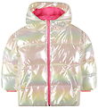 The duvet jacket has wide ribbed edges in the arm openings. On the front, the duvet jacket has two slanted pockets that are closed by a pleat.