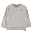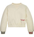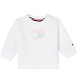 Stylish Tommy Hilfiger sweatshirt in dark blue with an eye-catching print on the chest with the text "TOMMY" in black surrounded by a narrow white edge. Below the text is the iconic Tommy Hilfiger logo embroidered, as well as a smaller logo embroidery on the left wrist.