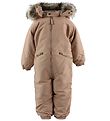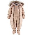 Cute Ver de Terre snowsuit in powder. The suit is made of a smooth woven material with horizontal seams that give a classic down jacket look, and it has a hood with a nice fur trim.