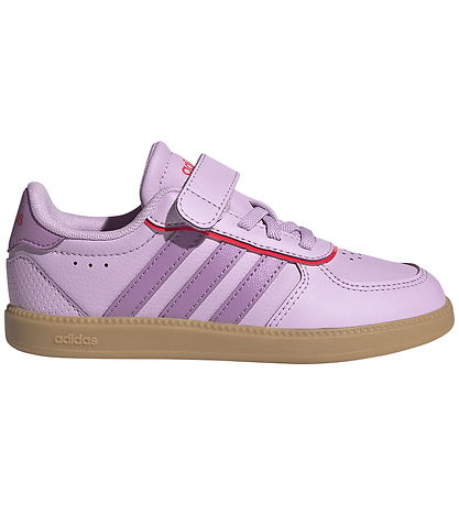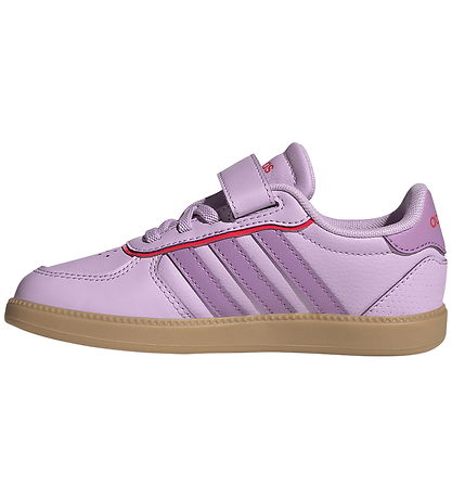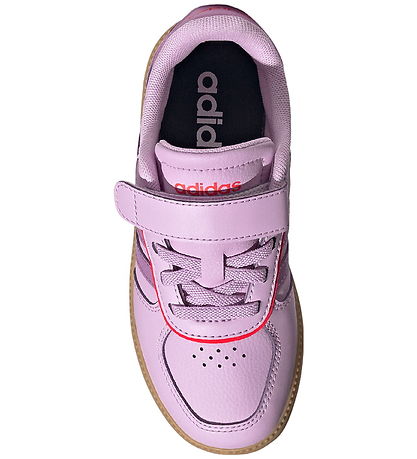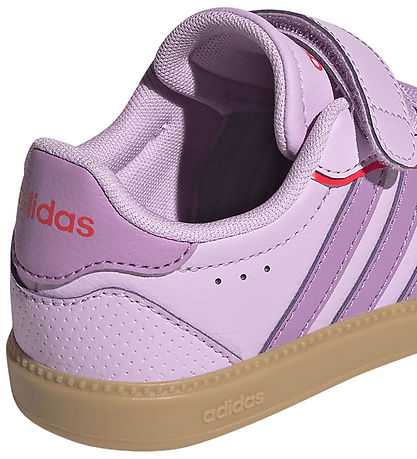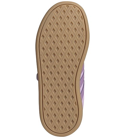 Stylish adidas Performance shoes in light purple imitation leather with purple logo stripes on the sides of the shoe. At the heel there is a purple set at the top, with "adidas" printed in orange, which gives a modern look.
