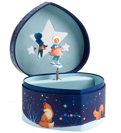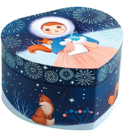 Beautiful Djeco music box in navy with brown foxes and squirrels on the side together with snowflakes in metallic blue. On the lid there is a girl wearing a pink dress and white skates in her hands.