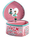 The Djeco music box is shaped like a heart, and inside there is a girl wearing a pink dress. When the music box is pulled up, the girl spins and the music box plays the tune "Let Me Call You Sweatheart" by Leo Friedman.