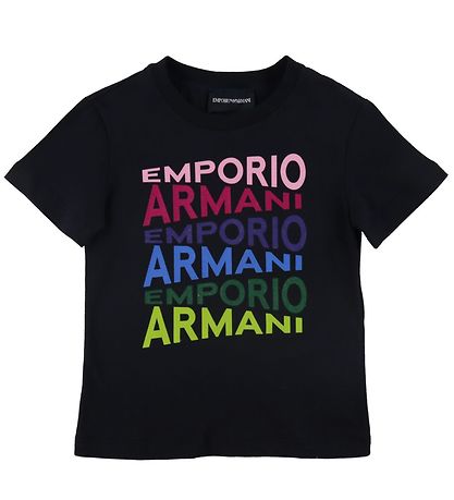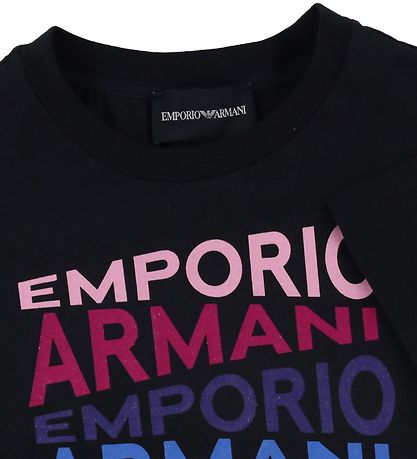 Nice Emporio Armani t-shirt in dark navy, and on the front it says "Emporio Armani" several times under one another with letters printed in pink, fuchsia, purple, blue, green and light green with glitter.
