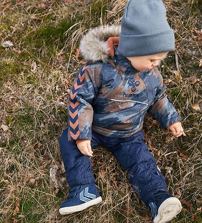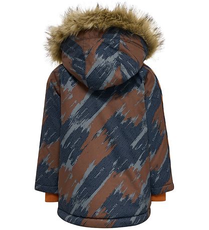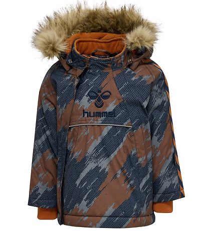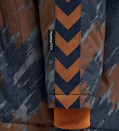 Cool Hummel winter coat with a shaded, camouflage-like print in navy blue, brown and grey blue -blue shades. The Winter coat has a navy blue, embroidered logo on the chest, and down the sleeves there are logo angle bands in navy blue and burnt orange. The lining is also in burnt orange.