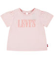 Beautiful Levis t-shirt with short sleeves in a light rose shade. The T-shirt has a large logo print on the front in a darker shade, which gives a harmonious look. It opens at the neck with a button above a teardrop neckline.