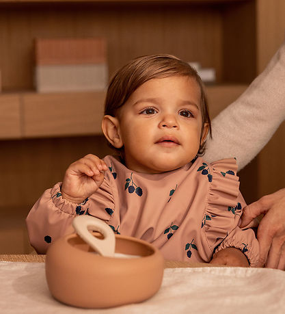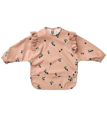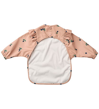 Practical Liewood apron in a warm, pink shade and with an allover print of blackberry. The Liewood apron has long sleeves with elastic edges, a collection pocket at the bottom and a practical snap closure at the neck.