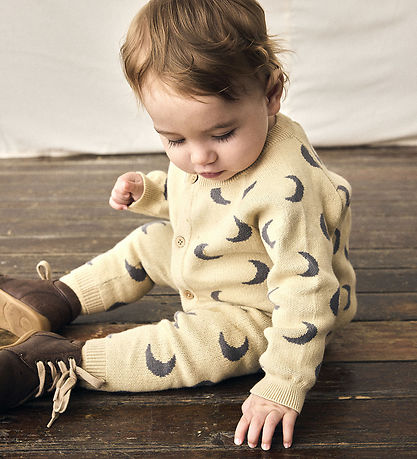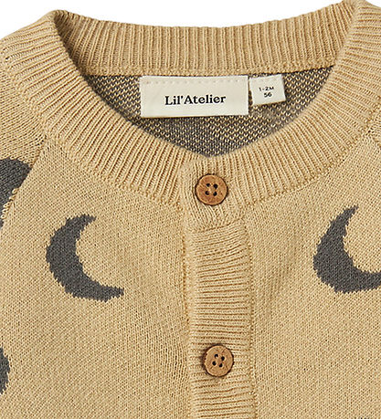 Beautiful Lil' Atelier cardigan with knitted structure in a warm light brown shade with a print of grey moons. The Lil' Atelier cardigan has a round neckline and continuous pull buttons at the front. It has long sleeves and wide ribbed edges in all openings of the cardigan.