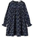 Elegant MarMar dress with a check pattern in beige and navy in a solid weave. The Dress has long sleeves and a button closure at the front, giving it a classic look. Additional details include ruffles at the collar and bottom edge, which add a refined touch to the MarMar dress.