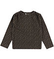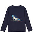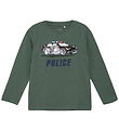 Practical Minymo blouse with long sleeves in a dark blue shade. The Blouse has a colorful print of excavators and tractors on the front, making it a fun choice for everyday wear.