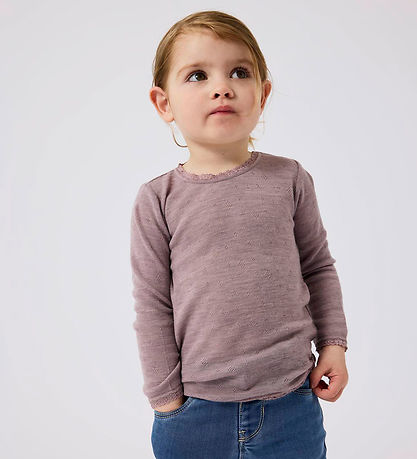 The Name It blouse has long sleeves and a nice lace edge in the neck opening. In all openings there are fine lace edges. It is made in a stretchy and soft wool quality.