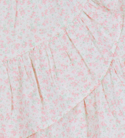 Beautiful Name It skirt in white with a delicate, pink floral pattern. The Skirt from Name It has an elastic waist and a characteristic wrap design with a ruffle edge at the bottom. The combination of pattern and structure gives a light and airy look.
