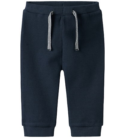 Practical Name It sweatpants in navy blue with a ribbed structure. The sweatpants have a good elastic at the waist, which can be adjusted with internal buttons. There are decorative drawstring at the front. The sweatpants have elastic in the leg openings, which provides a good fit.