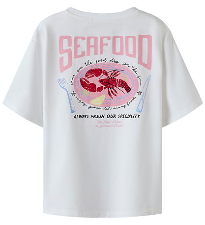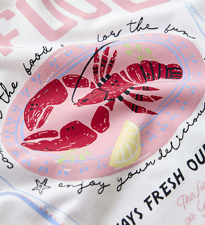 Beautiful Name It t-shirt in classic white. The T-shirt is decorated with a red print with a lobster and the text "Seafood". The Name It t-shirt has a round neckline and short sleeves. The print gives a stylish look, and the round neckline contributes to the t-shirt's simple design.