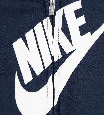 The Nike cardigan is navy blue with a large white logo print on the front. It has a soft hood and a full-length zipper at the front. It has long sleeves with ribbed edges at the sleeve and waist opening.