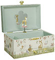 The Petit Monkey jewelry box comes in a square shape. Inside the jewelry box there is a music box, which is wind up on the back. When it wind up and the lid is opened, a small grey rabbit on a pink flower appears, which spins around, while the jewelry box plays "Blue Bird of Happiness".