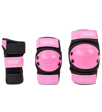 The SFR protection set protects the exposed areas of the kid when they are out on rollerskates, scooter, skateboard or riding a balance bike. The leg or arm is guided down through the opening, and then the various parts can be fastened with wide elastics with velcro closure. The Knee and elbow protectors have a soft polyester backing so that the straps do not irritate the skin.