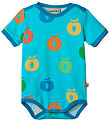 Colourful bodysuit from Småfolk in a blue shade with the classic apple print in orange, green and blue. The Bodysuit has short sleeves and opens at the shoulders and between the legs with push buttons, making it easy to put on.