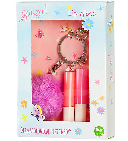 Nice Souza set with a keychain, in which there are two pink lipgloss (strawberry and raspberry) and a purple pom-pom.