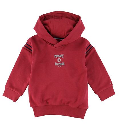 Beautiful Tommy Hilfiger hoodie in red, with the brand name printed in black and white on the front. Where the sleeves starts there are black stripes and over the left wrist there is an embroidered logo.