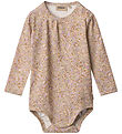 Nice bodysuit from Wheat with long sleeves and a light background with floral print in pastel. The design features button closure at the bottom and a cute detail at the neck.