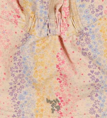 Fantastic Wheat swim hat in a light, beige shade, decorated with a pattern of delicate flowers in pink, yellow and purple colours.