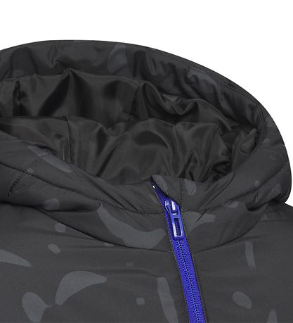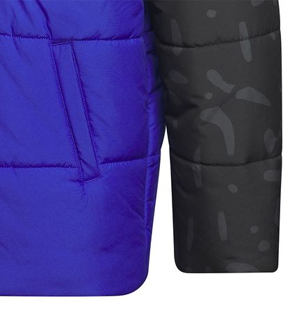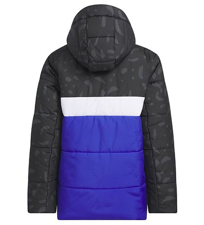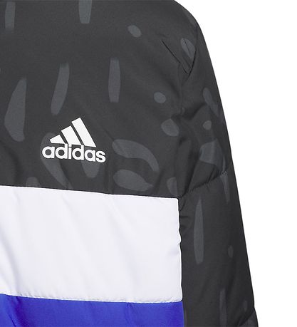Nice adidas Performance puffer jacket in blue, white and black with grey leopard dots. The duvet jacket has horizontal seams and a white logo print on the left chest.